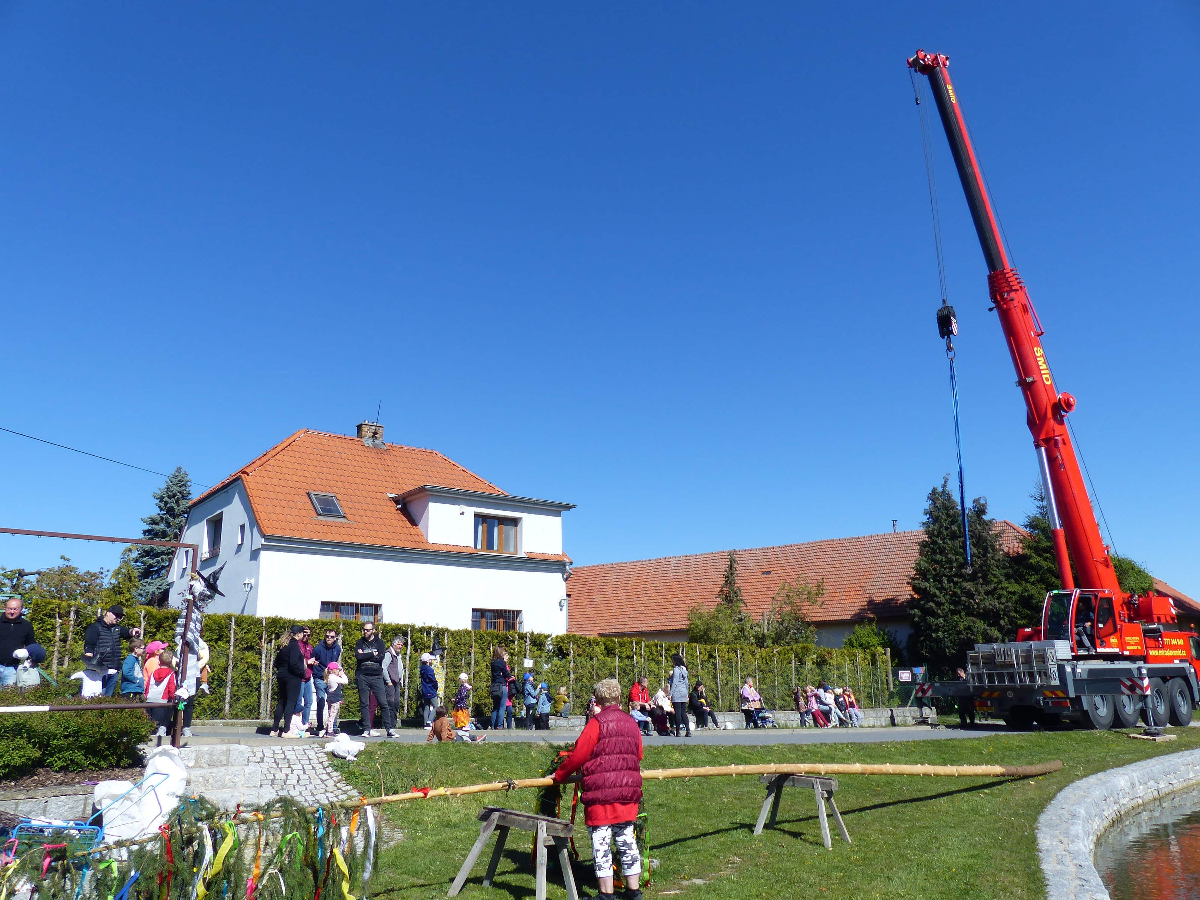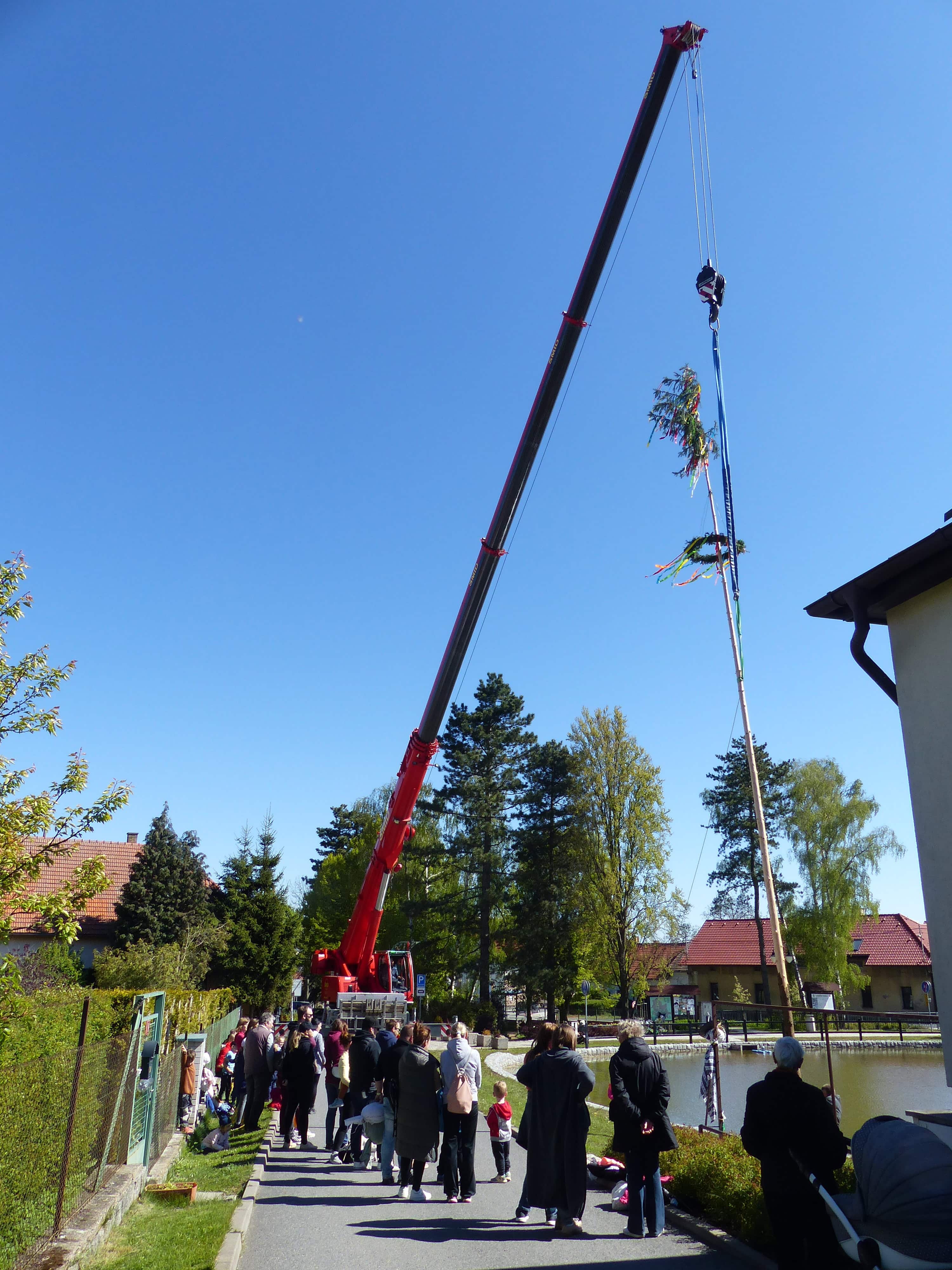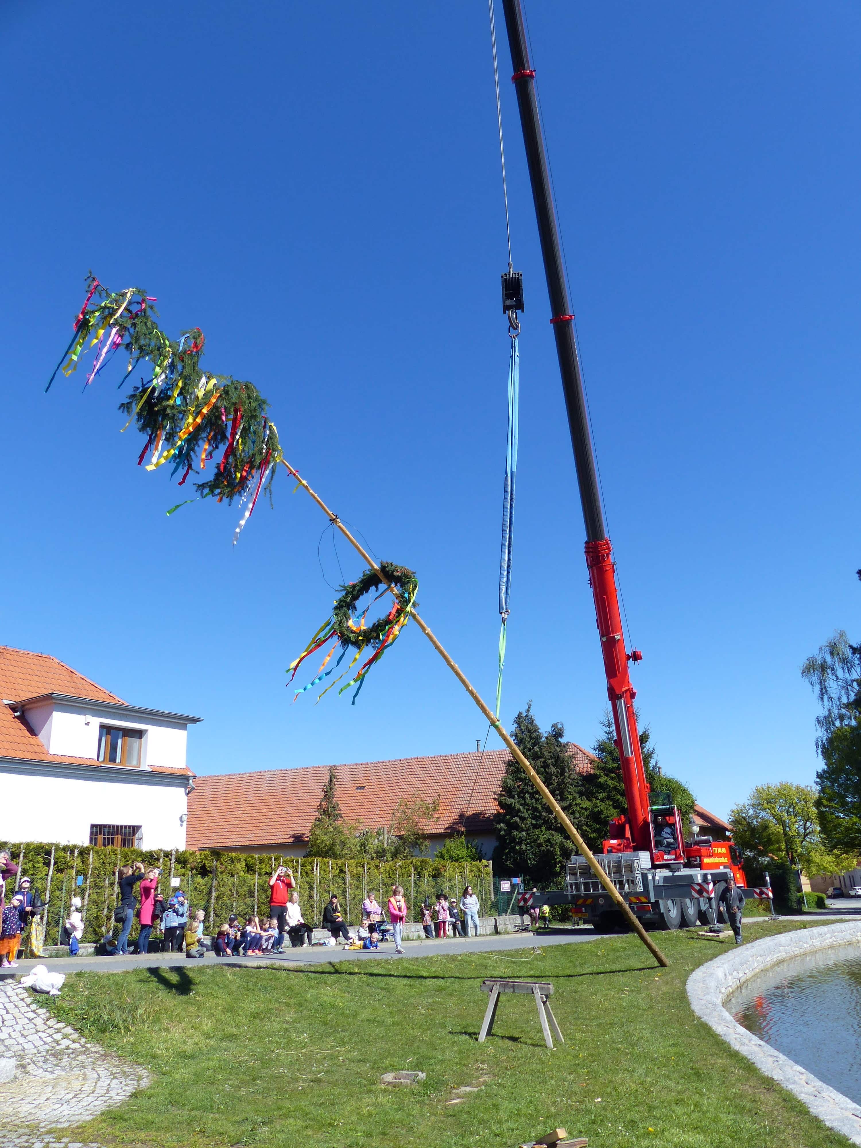 Největším zážitkem pro naše malé kluky bylo, když byla májka umístěna pomocí obrovského jeřábu, jehož rameno sahalo téměř do nebes. Chceme tímto poděkovat firmě Miroslav Šmíd za zapůjčení jeřábu a za to, že nám s tímto úkolem pomohli.